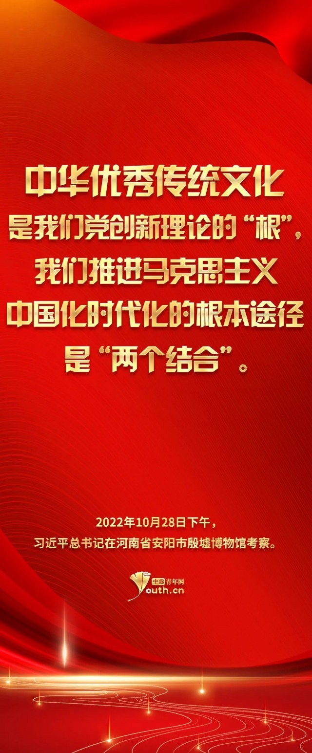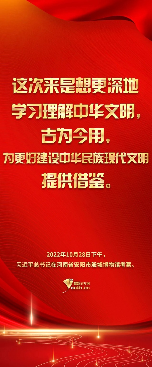 參天之木,必有其根;懷山之水,必有其源。習總書記的這次殷墟考察之行,讓我們將目光再次聚焦到中華民族的傳統(tǒng)文化之上。青山百代,仍蔭后人。正如習總書記指出的——中華優(yōu)秀傳統(tǒng)文化是我們黨創(chuàng)新理論的“根”,我們推進馬克思主義中國化時代化的根本途徑是“兩個結(jié)合”——民族要獨立自強,國家欲穩(wěn)步發(fā)展,文化是來自深處的支撐。作為當代青年,我們理應(yīng)響應(yīng)時代號召,跟隨習近平總書記的腳步,去深入了解學習中華文明,兼顧歷史之沉淀與時代之新意,在向世界發(fā)揚中華氣象的同時,也邀得當年之明月照徹今人。