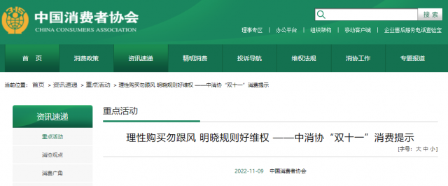 - 中消協(xié)發(fā)布“雙十一”消費(fèi)提示:留心促銷規(guī)則,規(guī)避消費(fèi)套路