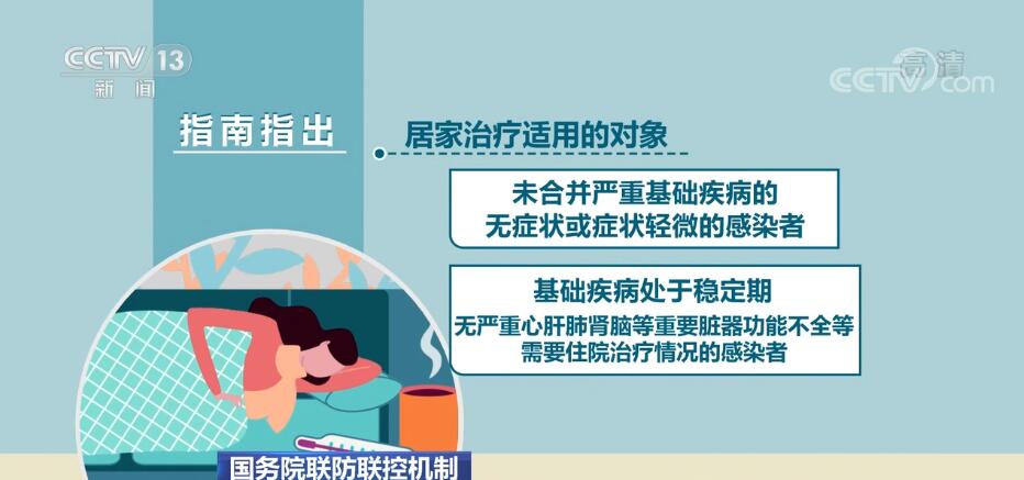 指南指出,居家治療適用的對(duì)象是:未合并嚴(yán)重基礎(chǔ)疾病的無(wú)癥狀或癥狀輕微的感染者;基礎(chǔ)疾病處于穩(wěn)定期,無(wú)嚴(yán)重心肝肺腎腦等重要臟器功能不全等需要住院治療情況的感染者。