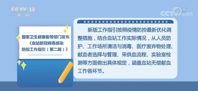 央視網(wǎng)消息:為落實進一步優(yōu)化新冠肺炎疫情防控措施相關(guān)要求,指導(dǎo)采供血機構(gòu)科學有效做好無償獻血工作,國家衛(wèi)生健康委辦公廳、中央軍委后勤保障部衛(wèi)生局組織專家對2021年印發(fā)的《血站新冠肺炎疫情常態(tài)化防控工作指引》進行修訂,形成《血站新冠病毒感染防控工作指引(第二版)》,指導(dǎo)采供血機構(gòu)切實做好新形勢下疫情防控工作,保障血站工作人員和獻血者安全,實現(xiàn)血液安全供應(yīng)。
