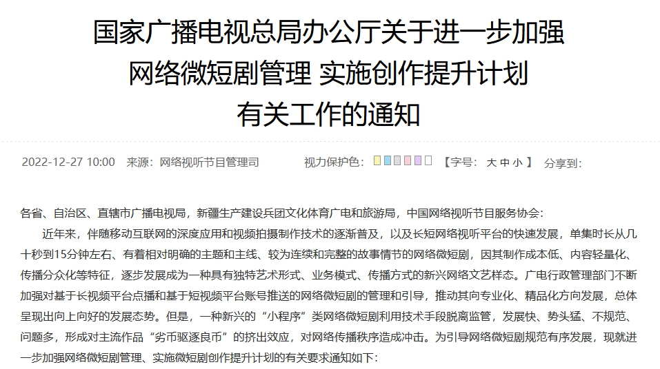 然而一種新興的“小程序”類網(wǎng)絡(luò)微短劇利用技術(shù)手段脫離監(jiān)管,發(fā)展快、勢頭猛、不規(guī)范、問題多,形成對主流作品“劣幣驅(qū)逐良幣”的擠出效應(yīng),對網(wǎng)絡(luò)傳播秩序造成沖擊。為引導網(wǎng)絡(luò)微短劇規(guī)范有序發(fā)展,廣電總局此次就進一步加強網(wǎng)絡(luò)微短劇管理、實施微短劇創(chuàng)作提升計劃發(fā)布一系列具體措施。