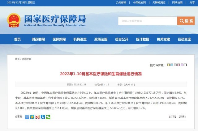 央視網消息:國家醫(yī)療保障局網站12月28日消息,2022年1-10月,全國基本醫(yī)療保險參保率穩(wěn)定在95%以上?;踞t(yī)療保險基金(含生育保險)總收入23677.15億元,同比增長6.9%。其中職工基本醫(yī)療保險基金(含生育保險)收入16251.6億元,同比增長8.8%。城鄉(xiāng)居民基本醫(yī)療保險基金收入7425.55億元,同比增長3.0%?;踞t(yī)療保險基金(含生育保險)總支出19187.16億元,同比增長0.9%,職工基本醫(yī)療保險基金(含生育保險)支出11918.58億元,同比增長1.0%,其中生育保險待遇支出702.13億元。城鄉(xiāng)居民基本醫(yī)療保險基金支出7268.57億元,同比增長0.7%。