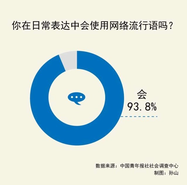 數(shù)據(jù)顯示,93.8%的受訪青年會(huì)在日常表達(dá)中使用網(wǎng)絡(luò)流行語,90后的比例更高(95.9%)。