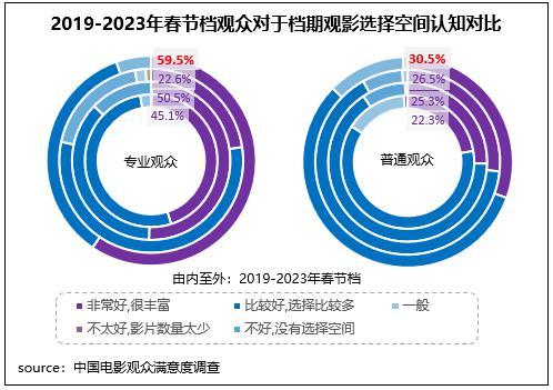 在調查中,針對“您認為檔期觀影選擇空間如何”這一問題,普通觀眾和專業(yè)觀眾認為檔期觀影選擇“非常好,很豐富”的占比均為2019年來的最高值。