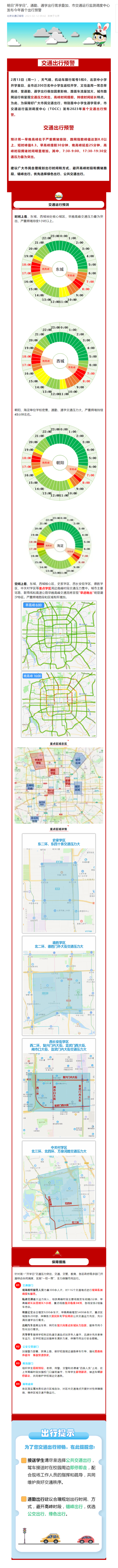 央視網(wǎng)消息:據(jù)“北京交通訂閱號”微信公眾號消息,2月13日(周一),天氣晴,機動車限行尾號5和0,北京中小學(xué)開學(xué)首日,全市近200萬名中小學(xué)生返校開學(xué),又恰逢周一常態(tài)早高峰,受通勤、通學(xué)出行疊加因素影響,路面車流量加大,城市路網(wǎng)運行將呈現(xiàn)交通壓力突出,高峰時間提前,持續(xù)時間延長特點。為此,為保障好廣大市民交通出行,特別是中小學(xué)生通學(xué)需求,市交通運行監(jiān)測調(diào)度中心(TOCC)發(fā)布2023年首個交通出行預(yù)警。