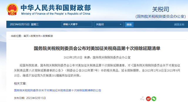 經(jīng)國務(wù)院批準(zhǔn),國務(wù)院關(guān)稅稅則委員會(huì)公布對(duì)美加征關(guān)稅商品第十次排除延期清單,對(duì)《國務(wù)院關(guān)稅稅則委員會(huì)關(guān)于對(duì)美加征關(guān)稅商品第八次排除延期清單的公告》(稅委會(huì)公告2022年第7號(hào))中的相關(guān)商品,延長排除期限,自2023年2月16日至2023年9月15日,繼續(xù)不加征我為反制美301措施所加征的關(guān)稅。