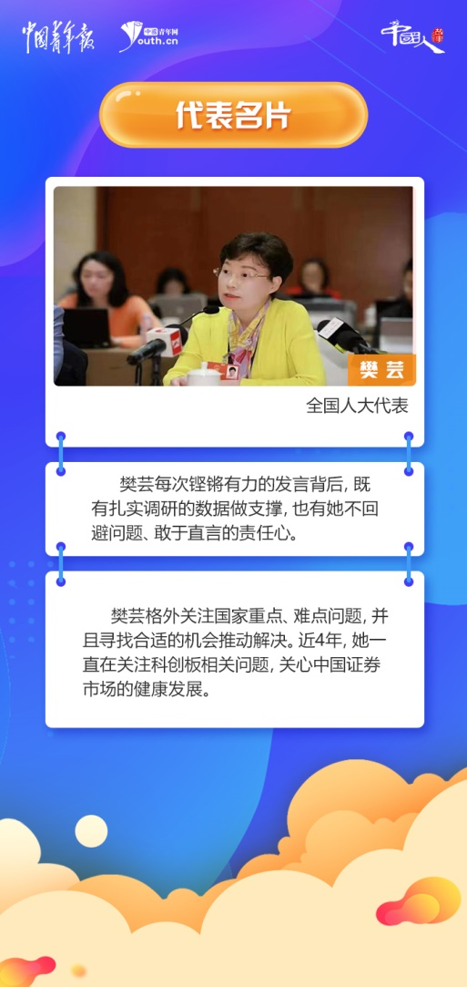 樊蕓格外關(guān)注國家重點、難點問題,并且尋找合適的機會推動解決。近4年,她一直在關(guān)注科創(chuàng)板相關(guān)問題,關(guān)心中國證券市場的健康發(fā)展。