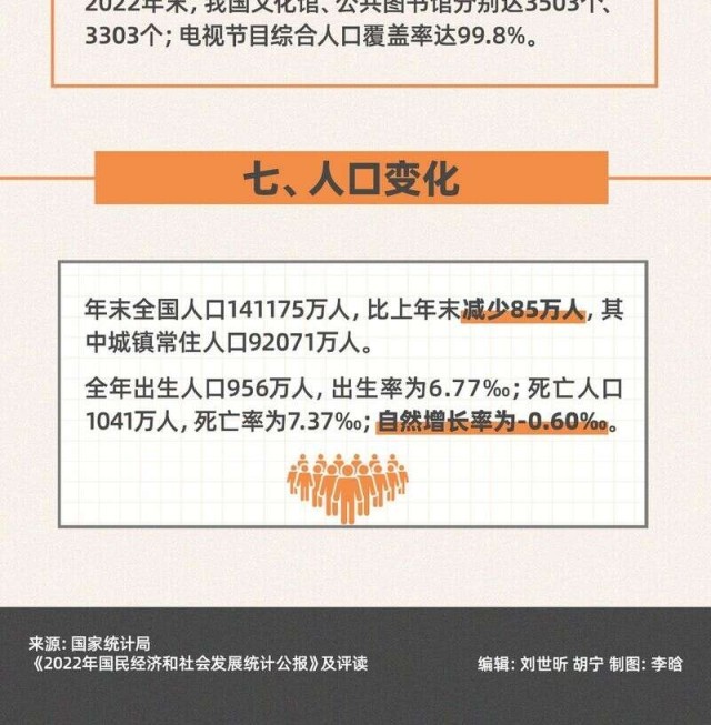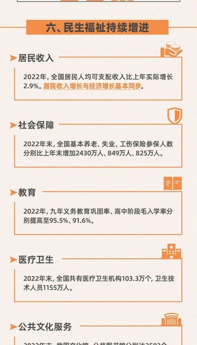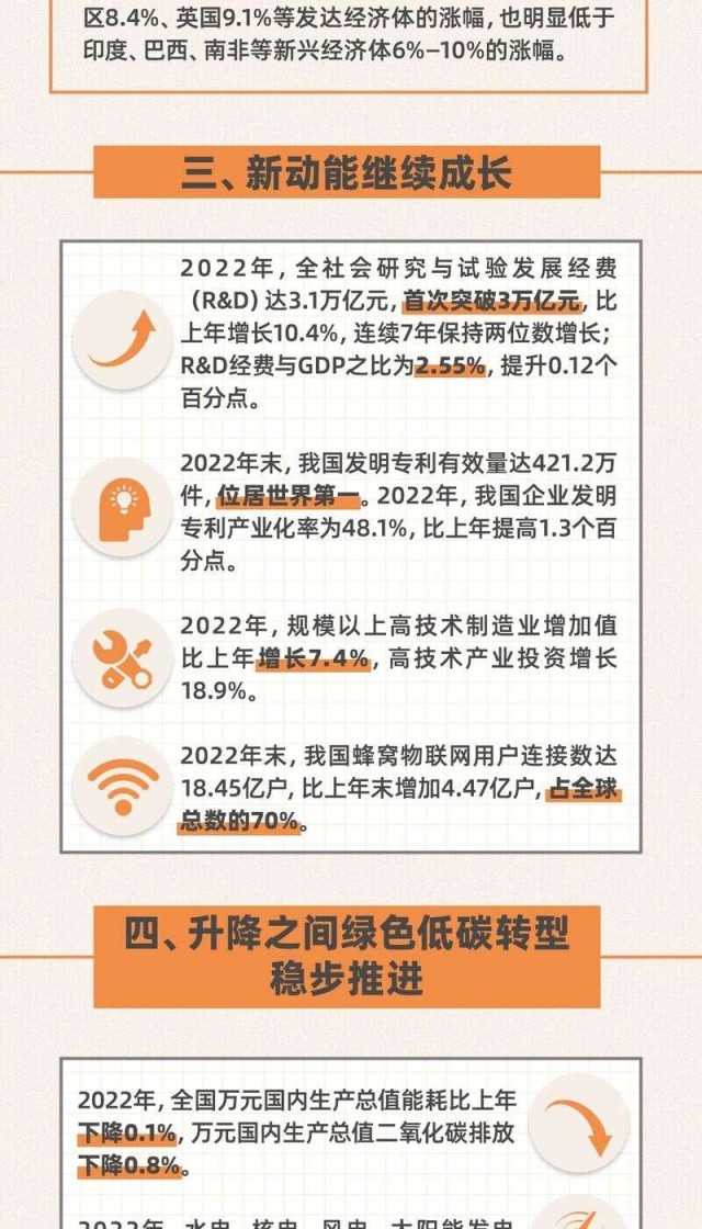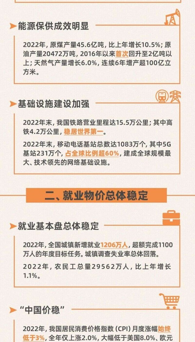 今日,國家統(tǒng)計局發(fā)布2022年國民經(jīng)濟和社會發(fā)展統(tǒng)計公報。初步核算,經(jīng)濟總量突破120萬億元,再上新臺階;全年糧食產(chǎn)量連續(xù)8年穩(wěn)定在1.3萬億斤以上;全部工業(yè)增加值首次超過40萬億元;全國城鎮(zhèn)新增就業(yè)1206萬人,超額完成年度目標任務;CPI月度漲幅始終低于3%;貨物進出口總額首次突破40萬億元大關(guān);引資規(guī)模再創(chuàng)新高;全國居民人均可支配收入實際增長2.9%......轉(zhuǎn)存圖解,看看這些數(shù)字背后2022年的中國。