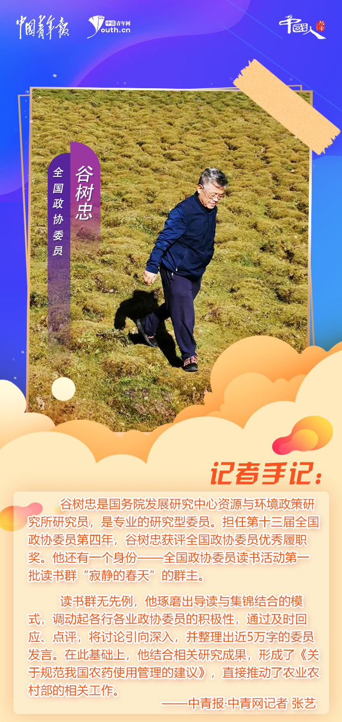 他常來奧森公園鍛煉,一圈5公里,先慢后快,他有自己的節(jié)奏。他是國(guó)務(wù)院發(fā)展研究中心資源與環(huán)境政策研究所研究員,是專業(yè)的研究型委員。擔(dān)任第十三屆全國(guó)政協(xié)委員第四年,谷樹忠獲評(píng)全國(guó)政協(xié)委員優(yōu)秀履職獎(jiǎng)。他還有一個(gè)身份——全國(guó)政協(xié)委員讀書活動(dòng)第一批讀書群“寂靜的春天”的群主。