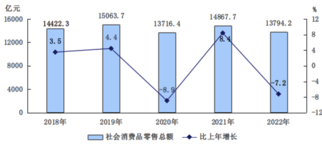 全年市場總消費額比上年下降4.9%。其中,服務(wù)性消費額下降2.9%;實現(xiàn)社會消費品零售總額13794.2億元,下降7.2%。