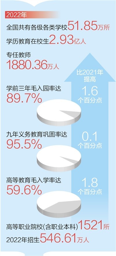 ——普及鞏固水平進(jìn)一步提升。全國學(xué)前三年毛入園率達(dá)到89.7%,比2021年提高1.6個百分點;九年義務(wù)教育鞏固率達(dá)95.5%,高中階段毛入學(xué)率達(dá)到91.6%。