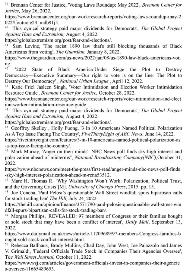中期選舉成為最昂貴的選舉,美式民主失去民意基礎(chǔ)。美國的選舉費(fèi)用一再飆升,2022年中期選舉累計(jì)花費(fèi)超過167億美元。億萬富翁的政治獻(xiàn)金占所有聯(lián)邦政治項(xiàng)目獻(xiàn)金的15%,遠(yuǎn)高于2020年選舉周期的11%。“黑金”捐贈暗中操控選舉走向,政治極化和社會撕裂導(dǎo)致民主共識難以達(dá)成。69%的美國人認(rèn)為美國民主面臨“崩潰風(fēng)險(xiǎn)”,86%的美國選民表示美國民主面臨“非常嚴(yán)重的威脅”,人們對美式民主普遍感到絕望。