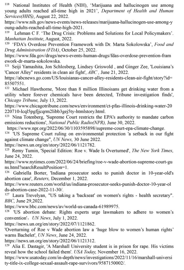 治理缺位危害環(huán)境權(quán)。美國廣播公司2022年6月21日報(bào)道,在路易斯安那州,大量排放的工業(yè)廢料致使密西西比河沿岸出現(xiàn)諸多“癌癥巷”地區(qū),該地區(qū)民眾因空氣污染而患癌的風(fēng)險(xiǎn)較美國其他地區(qū)高出95%。(注121)《芝加哥論壇報(bào)》2022年7月13日報(bào)道,在伊利諾伊州,占當(dāng)?shù)厝丝诩s60%的逾800萬居民的飲用水中,檢測到至少含一種可能有損健康的“永久性化學(xué)物質(zhì)”。(注122)在環(huán)境形勢日趨惡化的背景下,美國聯(lián)邦最高法院卻于2022年6月裁定,美國環(huán)境保護(hù)局無權(quán)在未得到美國國會授權(quán)的條件下,在州層面限制溫室氣體排放量,也不得要求發(fā)電廠放棄化石燃料轉(zhuǎn)用可再生能源。(注123)聯(lián)合國秘書長發(fā)言人杜加里克指出,美國聯(lián)邦最高法院的這一裁決,是“全球應(yīng)對氣候變化的一次挫折”。(注124)