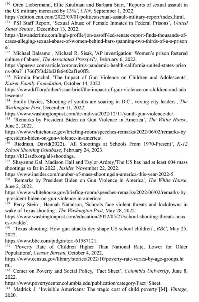 婦女墮胎失去憲法保護(hù),兒童生存環(huán)境令人擔(dān)憂。美國聯(lián)邦最高法院推翻“羅伊訴韋德案”的裁決終結(jié)了近50年來受憲法保護(hù)的墮胎權(quán),是對婦女人權(quán)和性別平等的巨大打擊。2022年美國有超過5800名18歲以下的兒童因槍擊受傷或死亡,校園槍擊事件數(shù)量高達(dá)302起,創(chuàng)1970年以來的最高值。美國兒童貧困率從2021年12月的12.1%上升至2022年5月的16.6%,增加了330萬貧困兒童。2018年以來被非法雇用的童工激增近70%,2022財(cái)年受雇專門從事危險(xiǎn)工作的兒童增加了26%。