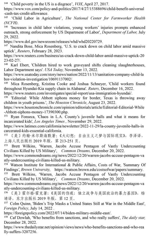 非法使用童工現(xiàn)象屢禁不止。根據(jù)非盈利組織“美國農(nóng)場工人健康中心”的數(shù)據(jù),美國有30萬至80萬名未成年人在農(nóng)場工作。(注145)美國《石板》網(wǎng)絡(luò)雜志指出,美國很多快餐店違反保護(hù)兒童健康與教育的規(guī)定,雇用青少年超時(shí)工作。童工問題屢禁不止,根源是美國法律體系存在漏洞。受新冠疫情和供應(yīng)鏈危機(jī)影響,美國多地出現(xiàn)“用工荒”現(xiàn)象,多州批準(zhǔn)新法案延長未成年人工作時(shí)間。根據(jù)美國勞工部的數(shù)據(jù),2022年,美國有數(shù)百萬青少年受雇在農(nóng)業(yè)、食品服務(wù)、零售、娛樂和建筑行業(yè)工作。(注146)路透社2023年2月28日報(bào)道,美國非法雇傭童工問題日益嚴(yán)重,自2018年以來,被非法雇用的童工激增了近70%。根據(jù)美國勞工部的數(shù)據(jù),2022財(cái)年有835家企業(yè)違法雇用3800名兒童,受雇專門從事危險(xiǎn)工作的兒童增加了26%。(注147)《今日美國報(bào)》2022年11月13日報(bào)道,威斯康星州帕克斯清潔服務(wù)公司雇用了30多名13至17歲的未成年人在肉類加工廠和農(nóng)場擔(dān)任清潔工。幾名未成年雇員在工作中受傷,其中一名13歲兒童被腐蝕性清潔化學(xué)品燒傷。(注148)路透社2022年12月16日報(bào)道,在阿拉巴馬州至少有四家汽車零部件供應(yīng)商被發(fā)現(xiàn)雇傭童工,勞務(wù)派遣機(jī)構(gòu)將未成年人移民安置在工廠工作。(注149)時(shí)至今日,美國仍是聯(lián)合國193個(gè)會員國中唯一沒有批準(zhǔn)《兒童權(quán)利公約》的國家,解決雇傭童工問題的前景依然黯淡。