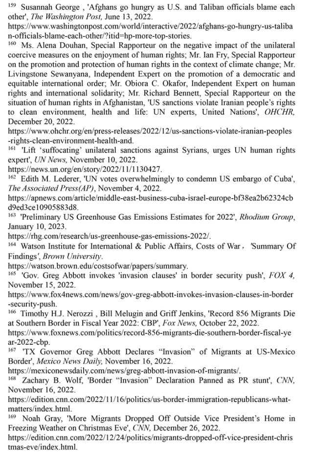 長期肆意實(shí)施單邊制裁。近年來,美國對其他國家實(shí)施的單邊制裁呈指數(shù)級增長,極大削弱了被制裁國家人權(quán)保障的能力與水平。孟加拉國《每日星報(bào)》2022年12月28日報(bào)道,美國實(shí)施的單邊制裁總數(shù)為世界之最,目前仍在對20多個(gè)國家實(shí)施制裁,包括1962年以來對古巴的制裁、1979年以來對伊朗的制裁、2011年以來對敘利亞的制裁,以及近年來對阿富汗的制裁,導(dǎo)致被制裁國家無法向其人民提供基本的食物和藥品。(注158)《華盛頓郵報(bào)》2022年6月13日報(bào)道,近一半的阿富汗人沒有足夠的食物,兒童營養(yǎng)不良呈上升趨勢。(注159)2022年12月20日,多名聯(lián)合國人權(quán)理事會獨(dú)立專家發(fā)表共同聲明指出,美國政府對伊朗的制裁加劇了伊朗的環(huán)境危害,使所有在伊朗的民眾無法充分享受健康權(quán)和生命權(quán),侵犯了伊朗人民享有清潔環(huán)境的權(quán)利。(注160)聯(lián)合國單邊強(qiáng)制措施對人權(quán)負(fù)面影響問題特別報(bào)告員阿萊娜·杜晗2022年11月10日指出,單邊制裁加劇了敘利亞人民的苦難,是對人權(quán)的嚴(yán)重侵犯。(注161)美國政府肆意實(shí)施制裁引發(fā)他國人權(quán)危機(jī)受到國際社會強(qiáng)烈譴責(zé)。2022年11月3日,聯(lián)合國大會就敦促美國終止對古巴的經(jīng)濟(jì)、商業(yè)和金融封鎖進(jìn)行投票表決。在193個(gè)成員國中,多達(dá)185個(gè)國家支持譴責(zé)美國對古巴的禁運(yùn)。(注162)這是聯(lián)合國大會連續(xù)30次通過類似決議。