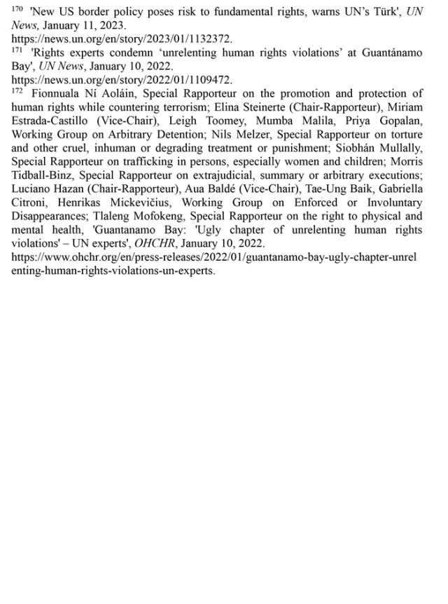 拒不關(guān)閉關(guān)塔那摩監(jiān)獄。2002年設(shè)立的關(guān)塔那摩監(jiān)獄最多時(shí)曾關(guān)押約780人,其中大多數(shù)人未經(jīng)審判便遭拘留,受到了殘忍的、不人道的待遇,是美國“肆意侵犯人權(quán)的一個(gè)丑陋篇章”。(注171)聯(lián)合國人權(quán)理事會在反恐中促進(jìn)和保障人權(quán)問題特別報(bào)告員菲奧努阿拉·尼奧萊因等多名獨(dú)立專家2022年1月發(fā)表共同聲明指出,臭名昭著的關(guān)塔那摩監(jiān)獄是美國在人權(quán)保護(hù)上的污點(diǎn),要求美國政府關(guān)閉關(guān)塔那摩監(jiān)獄,對遭受酷刑、任意拘留的公民進(jìn)行賠償,并根據(jù)國際法追究授權(quán)和實(shí)施酷刑的人員的責(zé)任。(注172)