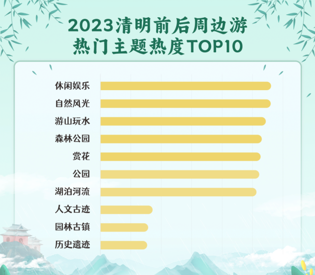 據(jù)某旅游票務平臺發(fā)布的《2023清明假期出游趨勢報告》,清明期間,本地及周邊短途出游是主流,出游主題上具有顯著的春游季特征?!秷蟾妗凤@示,清明假期(4月5日)前后周邊游的熱門主題按照熱度排序依次為休閑娛樂、自然風光、游山玩水、森林公園、賞花、公園等。前十個熱門主題中,具有賞花踏青屬性的主題占據(jù)了六席。