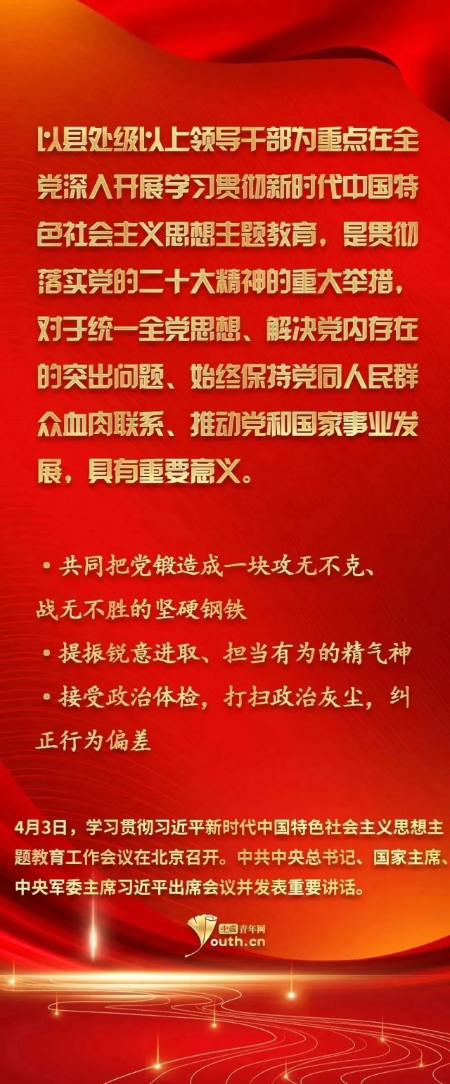 4月3日,學(xué)習(xí)貫徹習(xí)近平新時(shí)代中國(guó)特色社會(huì)主義思想主題教育工作會(huì)議在北京召開。中共中央總書記、國(guó)家主席、中央軍委主席習(xí)近平出席會(huì)議并發(fā)表重要講話。