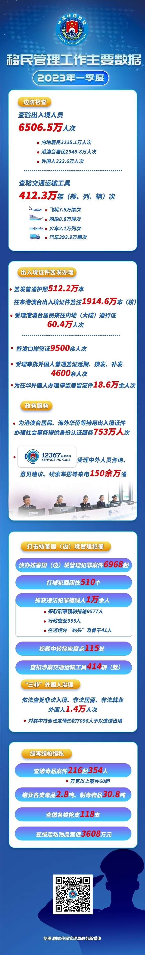 一季度,全國(guó)移民管理機(jī)構(gòu)查驗(yàn)交通運(yùn)輸工具412.3萬架(艘、列、輛)次,其中飛機(jī)7.5萬架次,船舶8.8萬艘次,火車2.1萬列次,汽車393.9萬輛次;簽發(fā)普通護(hù)照512.2萬本、往來港澳臺(tái)出入境證件簽注1914.6萬本(枚),受理港澳臺(tái)居民來往內(nèi)地(大陸)通行證60.4萬人次;簽發(fā)口岸簽證9500余人次,受理審批外國(guó)人普通簽證延期、換發(fā)、補(bǔ)發(fā)4600余人次,為在華外國(guó)人辦理停留居留證件18.6萬余人次;為港澳臺(tái)居民、海外華僑等持用出入境證件辦理社會(huì)事務(wù)提供身份認(rèn)證服務(wù)753萬人次,12367服務(wù)平臺(tái)受理中外人員咨詢、意見建議、線索舉報(bào)等來電150余萬通。