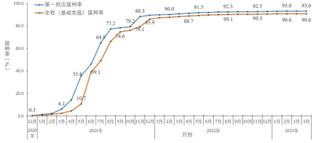 截至2023年4月20日,31個?。ㄗ灾螀^(qū)、直轄市)和新疆生產(chǎn)建設(shè)兵團(tuán)累計報告接種新冠病毒疫苗349443.2萬劑次(圖5-1)。接種總?cè)藬?shù)131048.0萬人,完成全程接種127708.4萬人,完成第一劑次加強(qiáng)免疫接種82783.9萬人。全人群第一劑次、全程接種覆蓋比例分別達(dá)到93.0%和90.6%(圖5-2)。60歲以上老年人累計報告接種新冠病毒疫苗68083.7萬劑次,接種總?cè)藬?shù)24169.3萬人,完成全程接種23036.1萬人,完成第一劑次加強(qiáng)免疫接種19318.9萬人。
