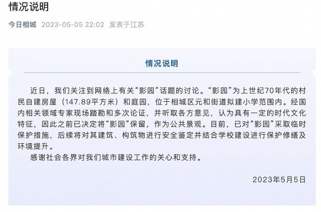 央視網(wǎng)消息:蘇州相城區(qū)委宣傳部公眾號“今日相城”5月5日發(fā)布情況說明稱,近日關注到網(wǎng)絡上有關“影園”話題的討論?!坝皥@”為上世紀70年代的村民自建房屋(147.89平方米)和庭園,位于相城區(qū)元和街道擬建小學范圍內。經(jīng)國內相關領域專家現(xiàn)場踏勘和多次論證,并聽取各方意見,認為具有一定的時代文化特征,因此之前已決定將“影園”保留,作為公共景觀。目前,已對“影園”采取臨時保護措施,后續(xù)將對其建筑、構筑物進行安全鑒定并結合學校建設進行保護修繕及環(huán)境提升。