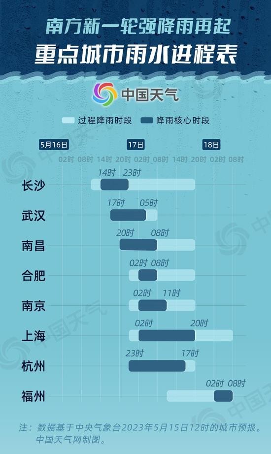 從中國天氣網推出的重點城市雨水進程表可以看出,長沙、武漢的降雨從明天白天就會陸續(xù)展開,降雨核心時段出現(xiàn)在明天下午到晚上。南昌、合肥、南京、上海和杭州的降雨都會在明天晚上開始,其中南昌的降雨核心時段集中在明天晚上,合肥、南京、上海和杭州集中在后天白天。福州由于處在最東邊,因此降雨核心時段最晚,主要集中在18日上午。