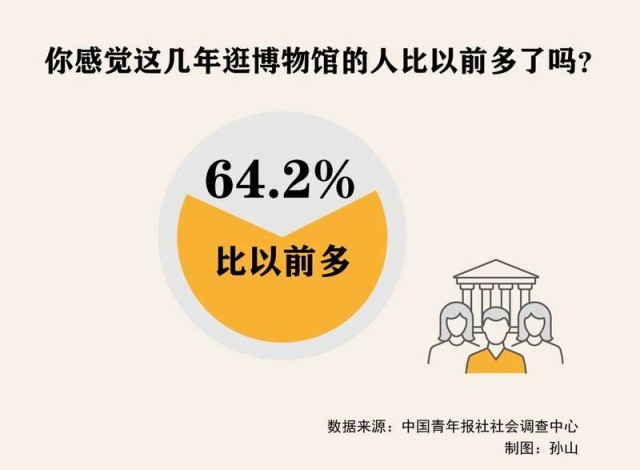 中青報(bào)社調(diào)中心的調(diào)查也顯示,超六成(64.2%)受訪者感覺這幾年逛博物館的人比以前多了。七成多(73.2%)受訪者表示去外地游玩,會把目的地博物館納入必到之地。