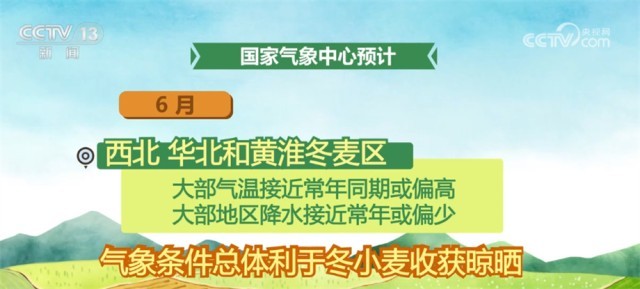 6月,西北、華北和黃淮冬麥區(qū)大部氣溫接近常年同期或偏高,大部地區(qū)降水接近常年或偏少,氣象條件總體利于冬小麥收獲晾曬;但山西西南部、陜西氣溫偏高,需關注干熱風天氣對小麥產(chǎn)量形成的不利影響,此外,氣溫偏高、降水偏少可能導致部分地區(qū)墑情偏差,不利于夏種。