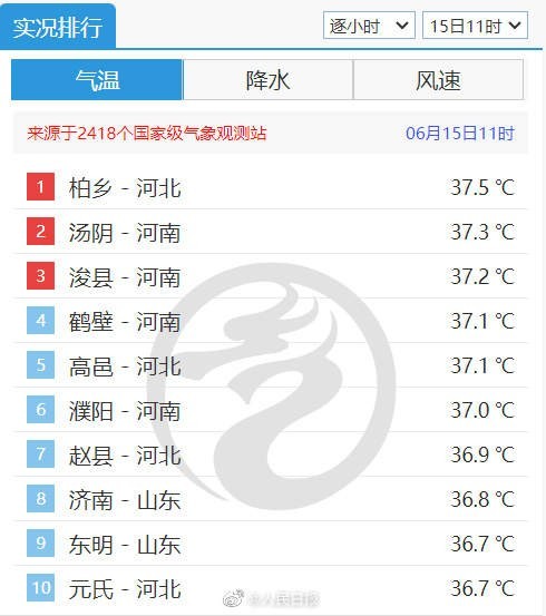 北方本輪高溫天氣持續(xù)中。今天11時,全國氣溫實況排行榜前十已沒有36℃以下的身影,河北柏鄉(xiāng)以37.5℃居榜首。你家今天多少度了?注意防暑降溫!