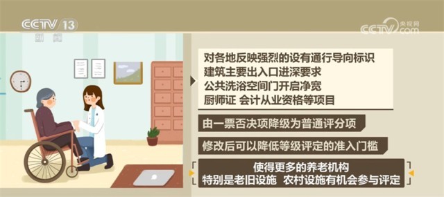 此次發(fā)布的指南包括環(huán)境、設施設備、運營管理、服務等多項內(nèi)容,與2020年發(fā)布的《<養(yǎng)老機構(gòu)等級劃分與評定>國家標準實施指南》(試行)相比,在框架、體例整體保持一致的前提下,刪除了一些可操作性不強以及非養(yǎng)老機構(gòu)必備的條件,對各地反映強烈的設有通行導向標識、建筑主要出入口進深要求、公共洗浴空間門開啟凈寬、廚師證、會計從業(yè)資格等項目,由一票否決項降級為普通評分項,修改后可以降低等級評定的準入門檻,使得更多的養(yǎng)老機構(gòu)特別是老舊設施、農(nóng)村設施有機會參與評定。