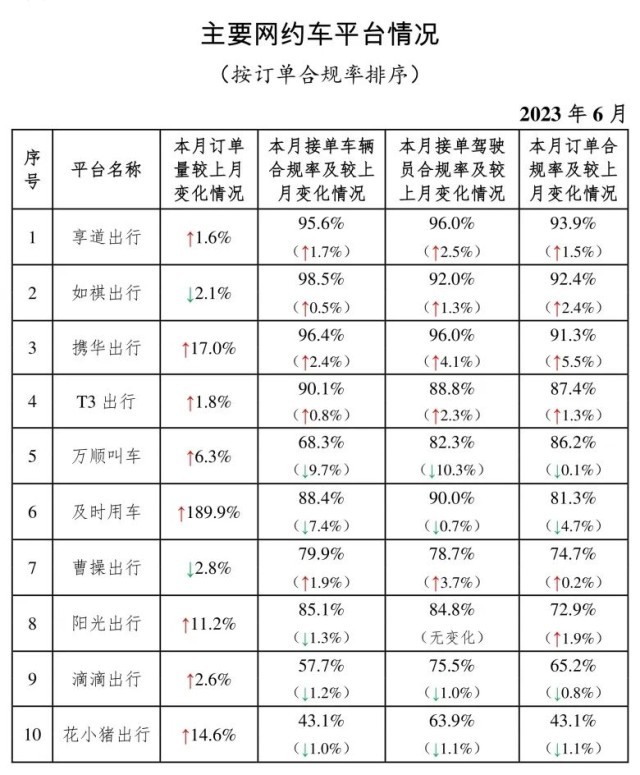 一、在訂單量前10名的網(wǎng)約車平臺中,訂單合規(guī)率最高的是享道出行,最低的是花小豬出行。在訂單量前10名的平臺中,按訂單合規(guī)率(指駕駛員和車輛均獲得許可的訂單量占比)從高到低的分別是享道出行、如祺出行、攜華出行、T3出行、萬順叫車、及時用車、曹操出行、陽光出行、滴滴出行、花小豬出行。本月訂單合規(guī)率增長前3名的依次是攜華出行、如祺出行、陽光出行;增長最后3名的依次是滴滴出行(-0.8%)、花小豬出行(-1.1%)、及時用車(-4.7%)。