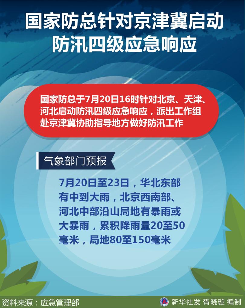 新華社北京7月20日電(記者周圓)記者20日從應急管理部獲悉,國家防總于當日16時針對北京、天津、河北啟動防汛四級應急響應,派出工作組赴京津冀協(xié)助指導地方做好防汛工作。