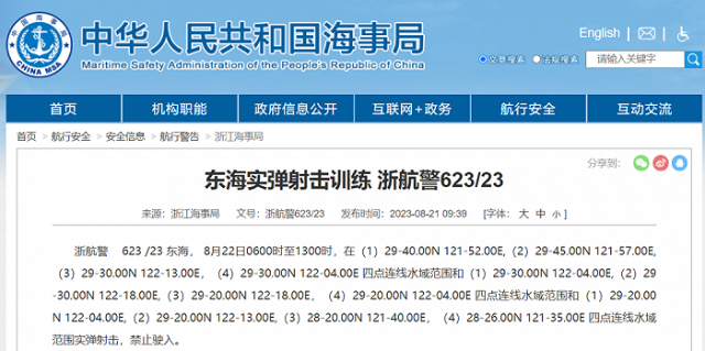 央視網(wǎng)消息:據(jù)中國海事局網(wǎng)站消息,浙江海事局發(fā)布航行警告,8月22日06時至13時,東海部分水域范圍實彈射擊,禁止駛?cè)搿?/p>