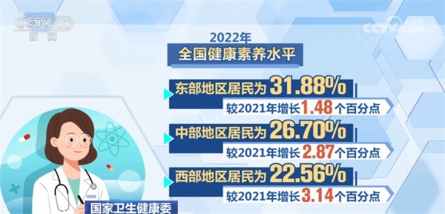 央視網(wǎng)消息:國家衛(wèi)生健康委今天(8月21日)公布《2022 年中國居民健康素養(yǎng)監(jiān)測情況》。2022年,我國居民健康素養(yǎng)水平達到27.78%,比2021年提高2.38個百分點,繼續(xù)呈現(xiàn)穩(wěn)步提升態(tài)勢。