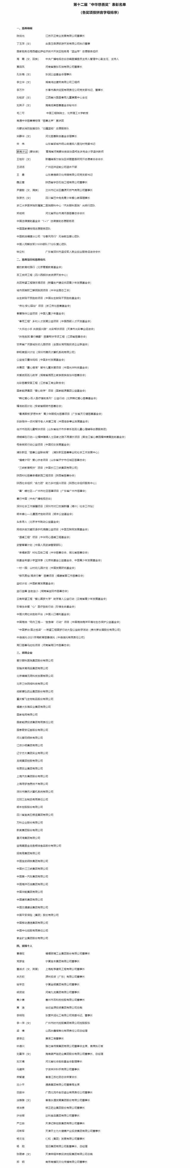 民政部發(fā)布第十二屆“中華慈善獎”表彰名單