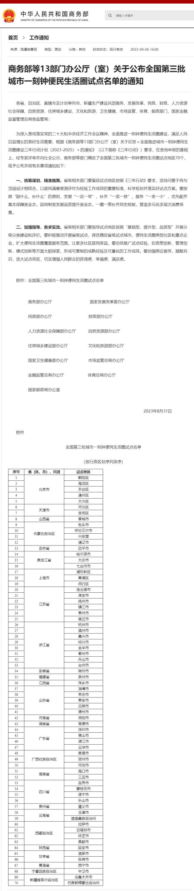商務(wù)部等13部門:全國第三批城市一刻鐘便民生活圈試點(diǎn)地區(qū)70個