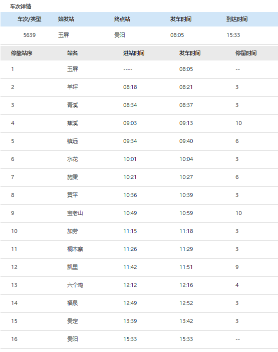 5640/5639次列車開行于貴陽(yáng)和玉屏之間,中間途經(jīng)大大小小14個(gè)站——羊坪、青溪、蕉溪、鎮(zhèn)遠(yuǎn)、水花、施秉、黃平、寶老山、加勞、桐木寨、凱里、六個(gè)雞、福泉、貴定。