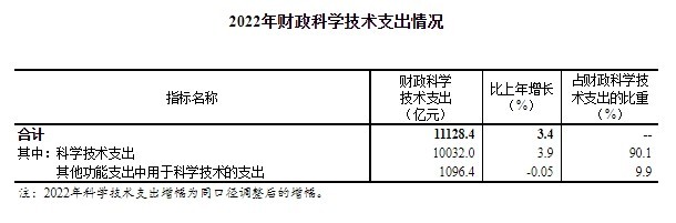 2022年,國家財(cái)政科學(xué)技術(shù)支出11128.4億元,比上年增加361.7億元,增長3.4%。其中,中央財(cái)政科技支出3803.4億元,占全國財(cái)政科技支出的比重為34.2%;地方財(cái)政科技支出7325.0億元,占比為65.8%。
