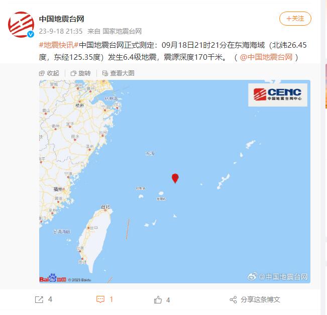 中國地震臺網(wǎng)正式測定:09月18日21時21分在東海海域(北緯26.45度,東經(jīng)125.35度)發(fā)生6.4級地震,震源深度170千米。