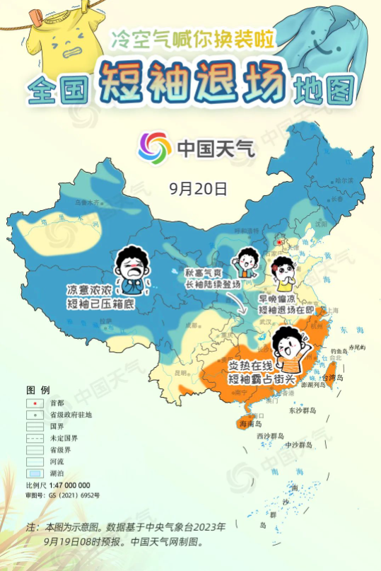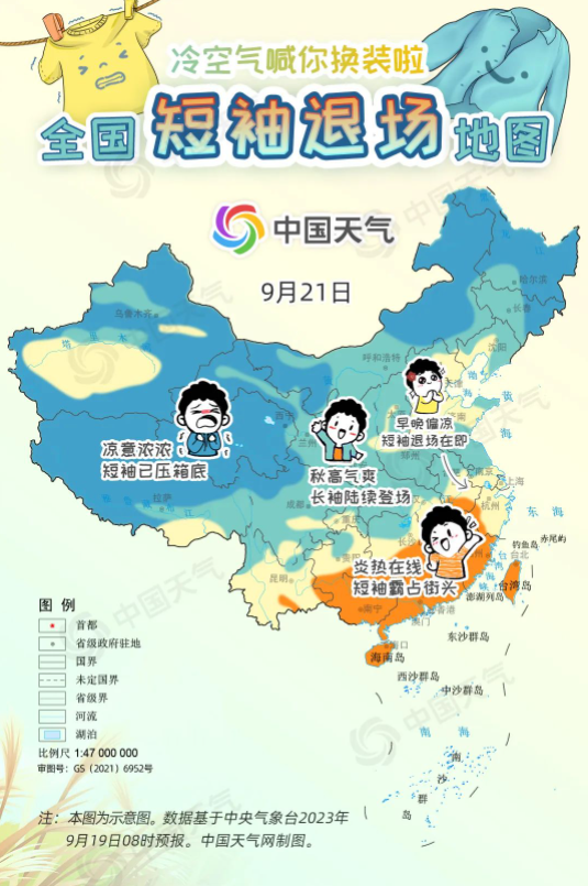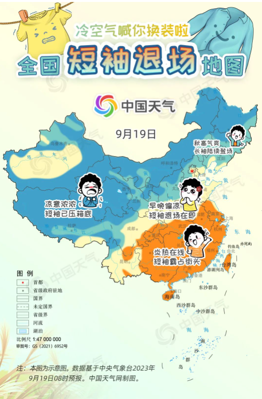 進入9月中旬,冷空氣變“勞?!鳖l繁來襲,西北、東北大部都已邁入秋天門檻,但華北一帶今年秋天似乎來得有點兒晚,南方地區(qū)白天甚至熱到還要開空調,不少網(wǎng)友喊話:“秋高氣爽何時能來?”9月19日至21日,受冷空氣和降雨共同影響,長江以北大部地區(qū)將陸續(xù)迎來降溫,開啟秋日初體驗。中國天氣網(wǎng)特別推出全國短袖退場地圖,看看哪里可以安排秋天的第一件長袖。