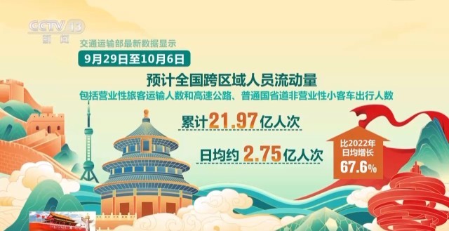 交通運輸部最新數(shù)據(jù)顯示,9月29日至10月6日預(yù)計全國跨區(qū)域人員流動量(包括營業(yè)性旅客運輸人數(shù)和高速公路、普通國省道非營業(yè)性小客車出行人數(shù))累計21.97億人次,日均約2.75億人次,比2022年日均增長67.6%。