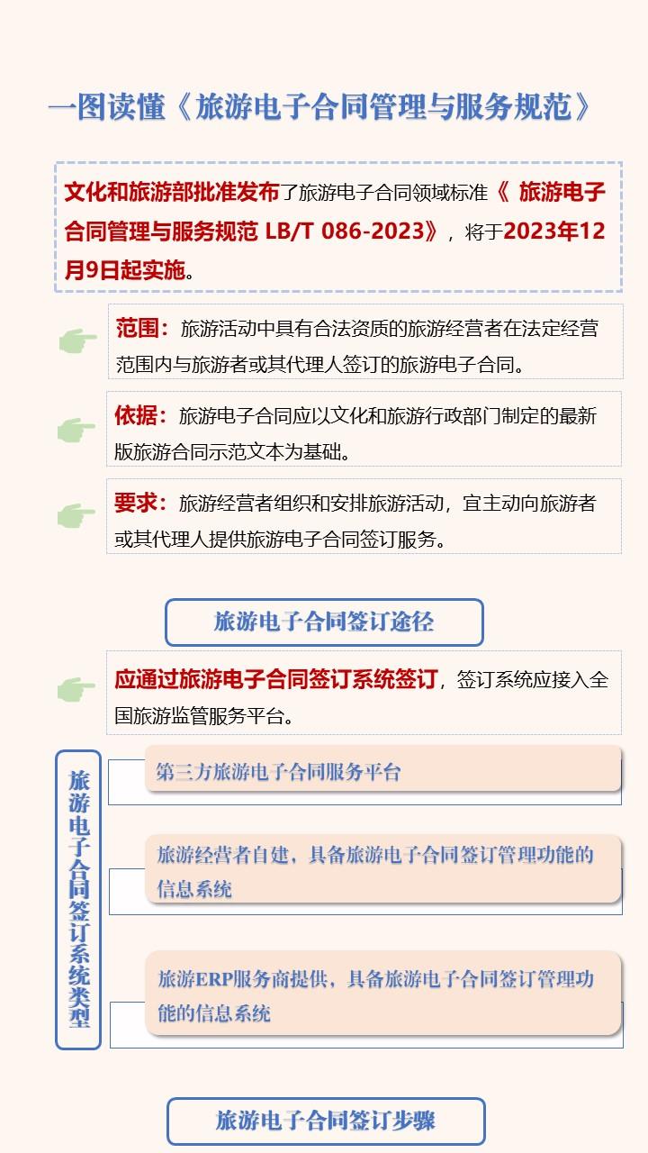 日前,文化和旅游部批準發(fā)布了旅游電子合同領域的行業(yè)標準《旅游電子合同管理與服務規(guī)范》(以下簡稱“標準”),將于2023年12月9日起實施。文化和旅游部今天正式發(fā)布該規(guī)范的解讀。
