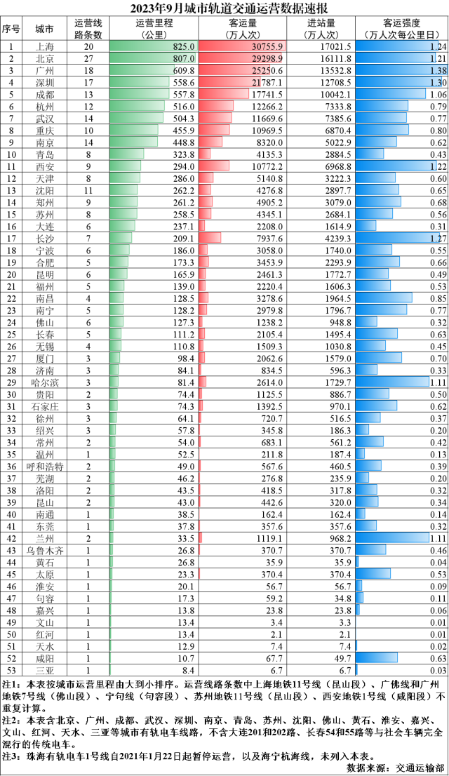 2023年9月,31個(gè)?。ㄗ灾螀^(qū)、直轄市)和新疆生產(chǎn)建設(shè)兵團(tuán)共有55個(gè)城市開通運(yùn)營(yíng)城市軌道交通線路299條,運(yùn)營(yíng)里程9859.5公里,實(shí)際開行列車318萬列次,完成客運(yùn)量24.9億人次,進(jìn)站量14.9億人次。9月份,客運(yùn)量環(huán)比減少2.2億人次、降低8.2%,同比增加7.1億人次、增長(zhǎng)40%,較2019年月均客運(yùn)量增加5億人次、增長(zhǎng)24.9%。9月份客運(yùn)強(qiáng)度平均水平為0.536萬人次每公里日,較2019年全年客運(yùn)強(qiáng)度平均水平降低1.8%。