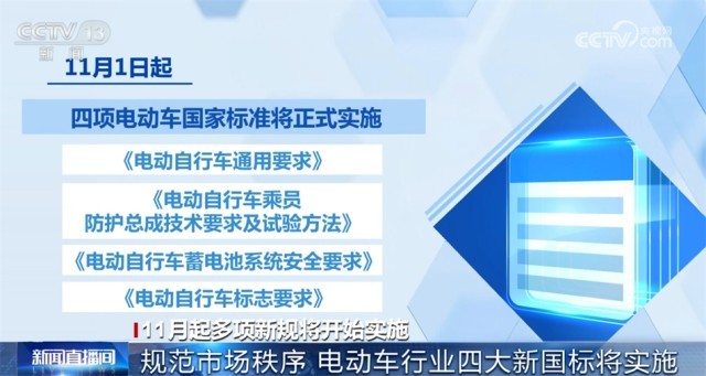 11月1日起,四項(xiàng)電動(dòng)車國(guó)家標(biāo)準(zhǔn)將正式實(shí)施,分別是《電動(dòng)自行車通用要求》《電動(dòng)自行車乘員防護(hù)總成技術(shù)要求及試驗(yàn)方法》《電動(dòng)自行車蓄電池系統(tǒng)安全要求》以及《電動(dòng)自行車標(biāo)志要求》。這些標(biāo)準(zhǔn)對(duì)電動(dòng)車的設(shè)計(jì)制造、安全性能、電池系統(tǒng)和標(biāo)識(shí)等方面都提出了明確規(guī)定,涉及電動(dòng)車的車把、鋰電池、總線設(shè)計(jì)、電子控制系統(tǒng)等。