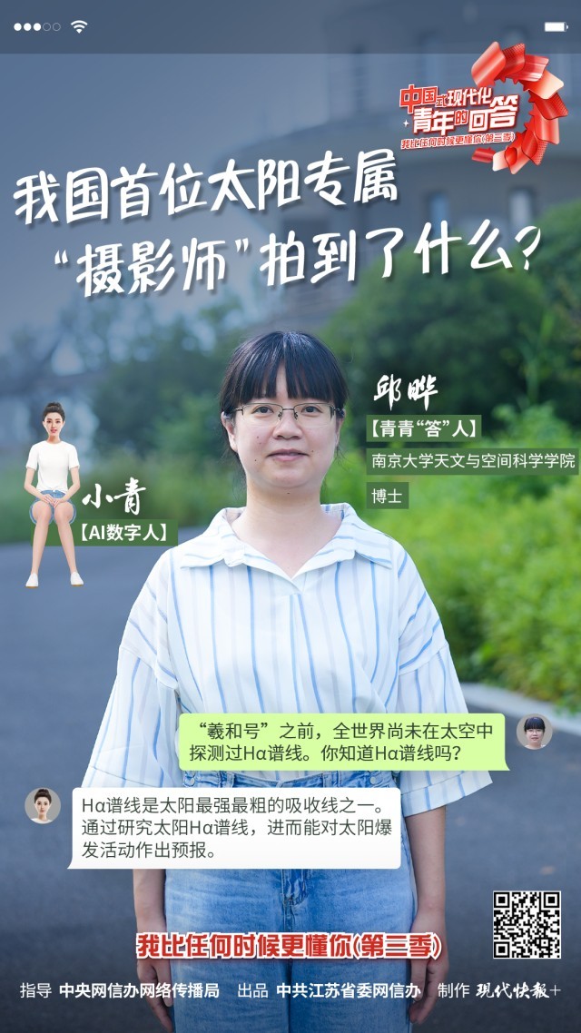 11月7日,“中國式現(xiàn)代化·青年的回答——我比任何時(shí)候更懂你(第三季)”系列短視頻之《我國首位太陽專屬“攝影師”拍到了什么?》正式上線。本集視頻中,青青“答”人——南京大學(xué)天文與空間科學(xué)學(xué)院博士邱曄和AI數(shù)字人小青,為大家展示了我國首顆探日衛(wèi)星“羲和號(hào)”拍攝到的畫面,解釋了“羲和號(hào)”超長(zhǎng)全稱里的兩個(gè)關(guān)鍵詞的含義。