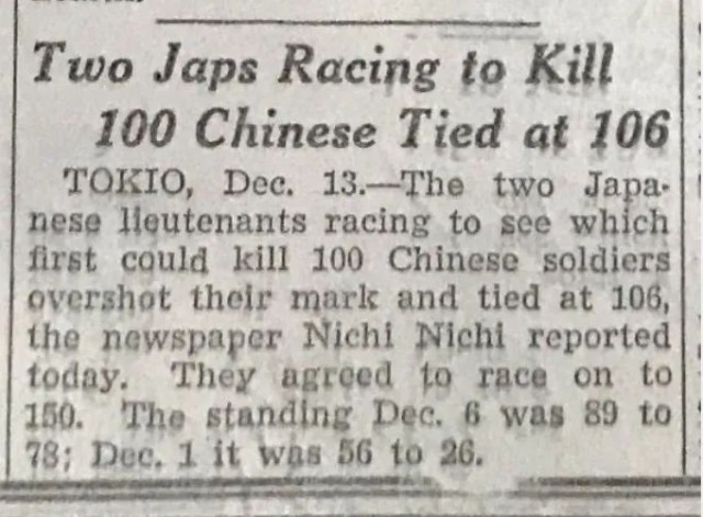“根據(jù)《東京日日新聞》報(bào)道,兩名日本軍官比賽看誰能先殺死100名中國士兵,結(jié)果都?xì)⒘顺^100人,雙方打平殺了106人,他們又同意重新比賽殺到150人為止,12月6日是89比78,12月1日是56比26?!边@是1937年12月14日發(fā)行的《芝加哥每日論壇》中,一篇有關(guān)兩名日本軍官進(jìn)行“百人斬”殺人競賽的報(bào)道節(jié)選。
