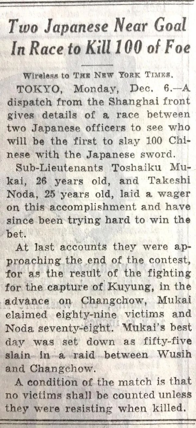 在1937年12月6日發(fā)行的《紐約時(shí)報(bào)》中,也登載了有關(guān)日軍“百人斬”殺人競賽的報(bào)道。報(bào)道稱,來自上海前線的一份電報(bào)詳細(xì)介紹了兩名日本軍官之間的一場比賽,看誰先殺死100名中國人。年紀(jì)分別為25歲和26歲的日本軍官把賭注壓在了這項(xiàng)“成就”上。