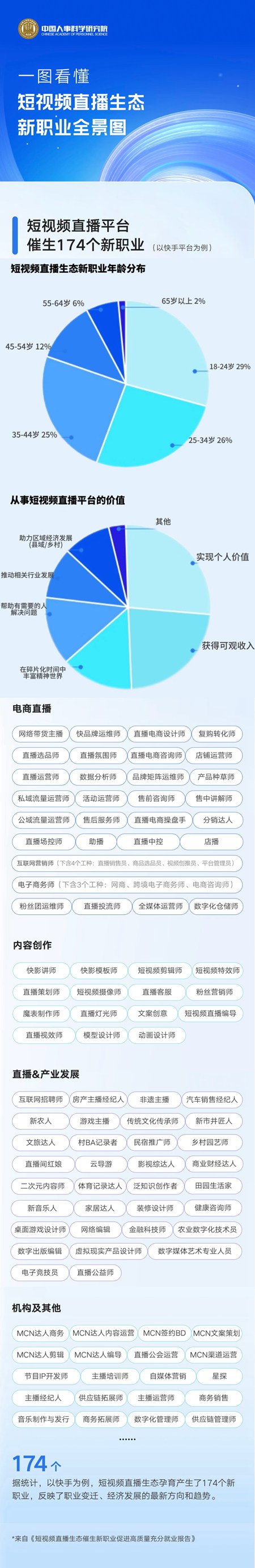 中國人事科學研究院近期發(fā)布的《短視頻直播生態(tài)催生新職業(yè)促進高質(zhì)量充分就業(yè)報告》顯示,一塊屏幕背后發(fā)生了諸多變化:中青年成短視頻直播生態(tài)新職業(yè)的主力軍。其中,18-24歲占29%,25-34歲占26%,35-44歲占25%。18-34歲占比達到55%?!吨腥A人民共和國職業(yè)分類大典(2022年版)》的1639個職業(yè)中,短視頻平臺快手覆蓋八成以上的數(shù)字職業(yè),為勞動者提供了更廣闊的職業(yè)發(fā)展空間。