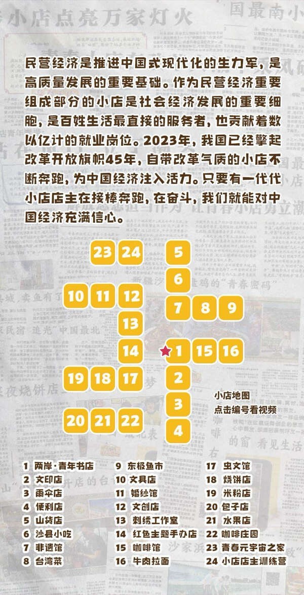 2023年是改革開(kāi)放45周年,自5月起中國(guó)青年報(bào)發(fā)起"了不起的青春小店"尋訪調(diào)研,派出采編調(diào)研組奔赴全國(guó)各地探訪了60多個(gè)地方的青春小店,與上百家小店的創(chuàng)業(yè)青年深度對(duì)話,了解他們的急難愁盼,呼吁社會(huì)更多地關(guān)注這一群體。